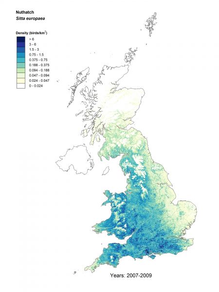 Nuthatch has a south-westerly distribution, being particularly abundant in deciduous woodlands of southern and western England, and Wales. It has increased widely, and is become more common in northern and eastern England, and southern Scotland, although with a hint of decline in Kent.