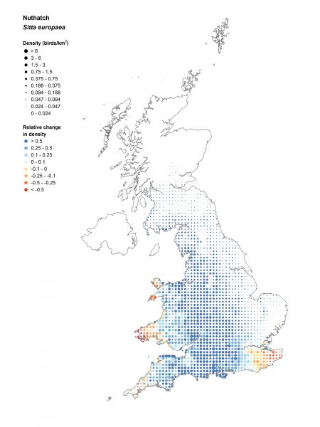 From maps of abundance it is relatively easy to produce maps of population trends, to see how bird populations are faring across the country. Work is currently underway to produce these for a range of relatively common and widespread species well-covered by the BBS survey, but we illustrate this with a couple of examples below: Curlew and Nuthatch, two species with contrasting fortunes. For each species we have produced a map of the density of birds across the UK during 2007–2009 (left), which predicts where the species is most abundant based on variation in habitat and location. This is complemented by a second map (right) of variation in the trend in that bird species from 1994–1997 to 2007–2009, in which the colour at each point now represents the change in abundance in each 10km square, and the size of the point indicates average density to help interpret how important these changes in abundance are. Therefore large red dots represent large declines in areas of high abundance, which are most likely to drive significant population declines whilst small red dots may indicate the locations where a species may be most likely to lost.