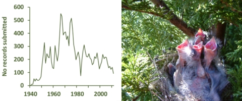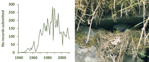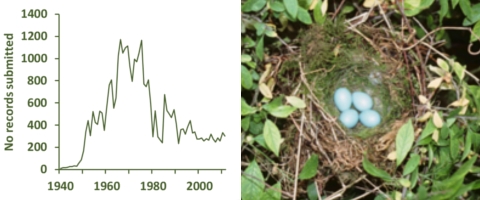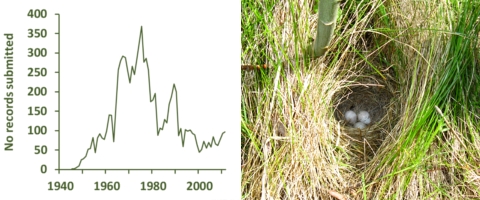 Record submissions peaked in the late 1990s at just under 650 nests per year, but have since fallen to almost zero. The species has declined steadily over the last two decades, although numbers are still much higher than they were in the 1960s. The species is on the BoCC Amber List.