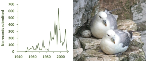 Non-passerine groups include seabirds, waterbirds, raptors, waders and owls. Numbers of records received for all seabird and wader species are low and/or aggregated and more submissions of any species would greatly increase our ability to accurately assess breeding success. Submissions for box-nesting raptors and owls (e.g. Barn Owl) are higher but more data on Kestrel and open-nesting species would also be very valuable. The following are examples of species for which submissions have declined significantly.