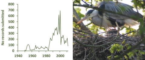 Record submissions peaked during the end of the 1990s at just under 700 nests per year, but have since fallen to below 100. Grey Heron numbers have increased moderately across the UK, more so in England and Wales than in Scotland, since the 1930s. The species is on the BoCC Green List.