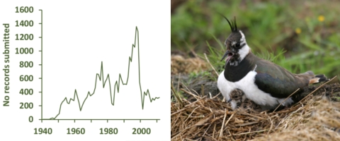 Record submissions peaked in the late 1990s at over 1,350 nests per year but have since fallen sharply to around 300. UK Lapwing populations have declined rapidly since the 1980s, with numbers falling by over 50%. The species is on the BoCC Red List.
