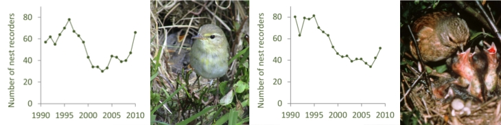 Open-nesting passerines are the group of species that we have highlighted as being the highest priority for NRS over the last decade. The number of records received for this group of c. 60 species had been decreasing rapidly since the 1970s, a particularly worrying statistic given that this group contains many of those species currently exhibiting the most severe population declines. Nest recorders' response to our appeals has been fantastic and the number of volunteers monitoring target species such as Linnet and Willow Warbler has increased significantly over the past few years.
