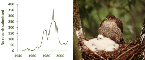 Record submissions peaked in the early 1990s at just over 350 nests per year but have since fallen to below 100. Sparrowhawk populations have increased rapidly in England during the 1970s and 1980s, but have levelled off over the last two decades. The species is on the BoCC Green List.