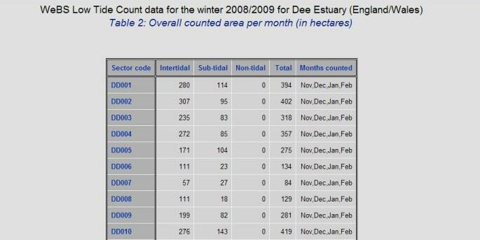 Table 2 gives the total area of each habitat type - Intertidal, subtidal and non-tidal present in each count section as calculated using ArcView GIS.