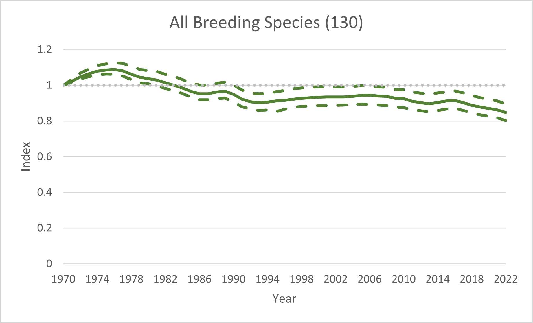 Figure 1. Changes in the abundance of all breeding birds between 1970–2022 in the UK. Source: BTO, Defra, JNCC, RSPB. Learn more about interpreting Bird Indicator graphs.